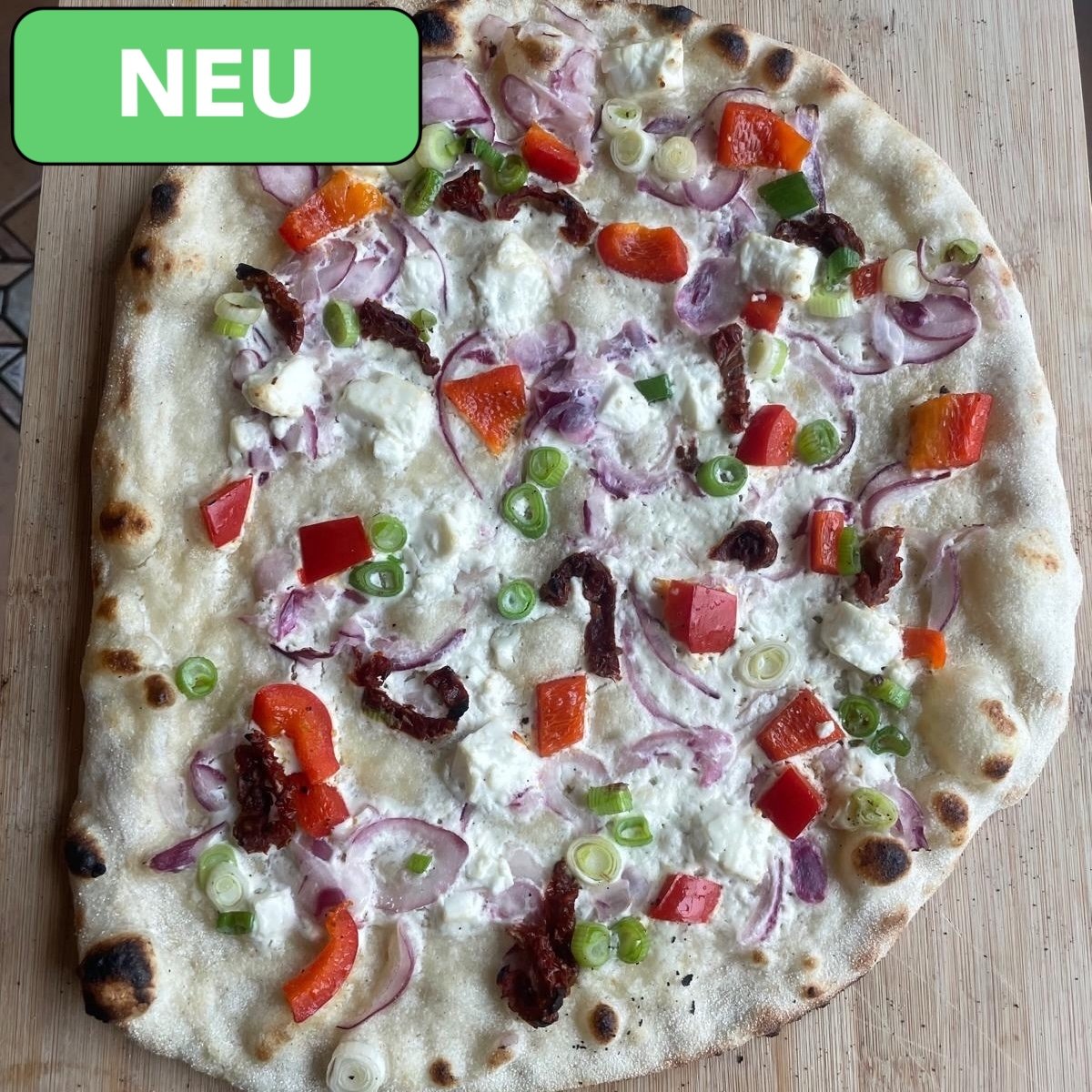Zwiebeln, Paprika, Frühlingszwiebeln, getrocknete Tomaten, Pilze, Käse